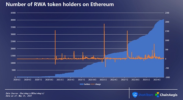 下圖為以太坊上RWA代幣持有者數量變化情況。總的來看,持幣者數量一直持續增長,較初期增長約72.53倍。其中,2022年1月11日,2020年11月22日,2022年7月26日,達日增長量Top 3,分別為1899,1546,1525。