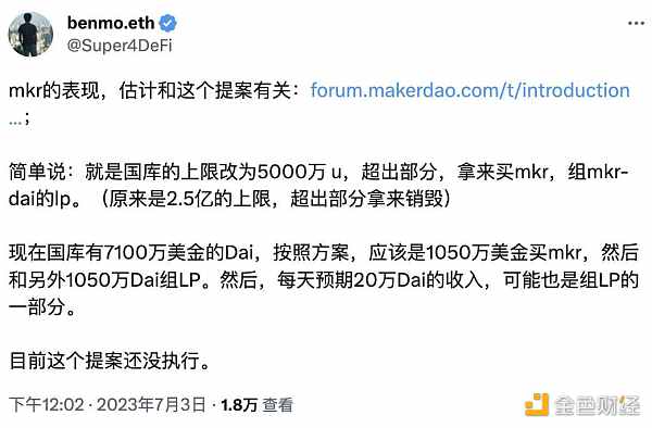 隨著 MakerDAO 新提案提議引入智能銷毀機制的推進,市場對于 MakerDAO 回購 MKR 的預期越來越強烈,這可能是導致市場看好 MKR 的原因。同時,MakerDAO 創始人 Rune Christensen 也曾在 2022 年底開始大量購買 MKR,花費數千萬美元。值得注意的是,作為 Lido 早期投資者,他當時其主要資金來源是出售其代幣 LDO。