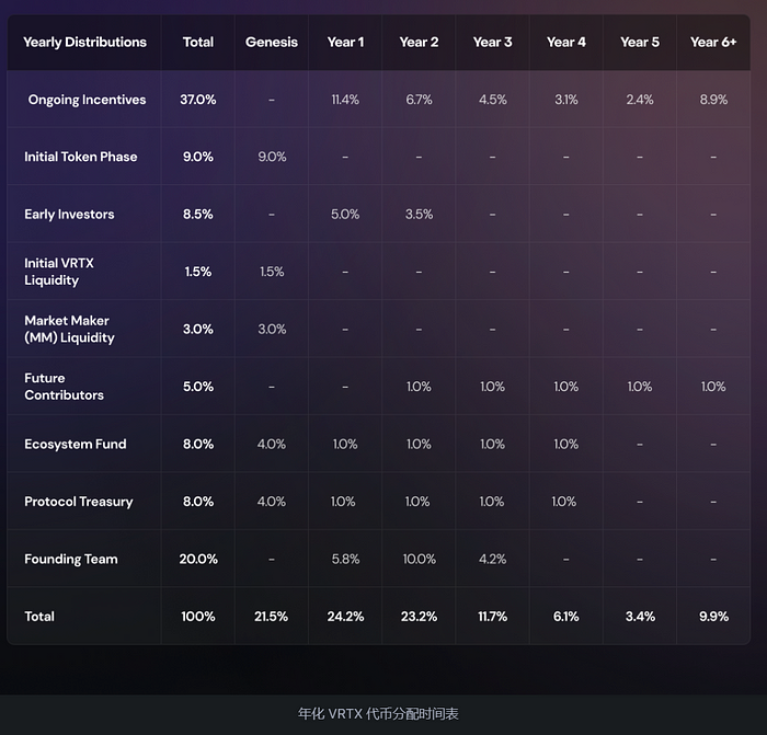 VRTX是Vertex Protocol的治理代幣,總供應量為10億枚,其中,90.08%的代幣將在5 年內分發。