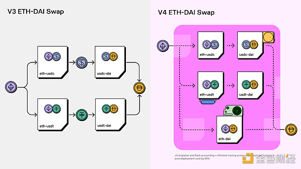 這種singleton架構由一個新的“閃算(flash accountin)”系統補充。該系統不是在 v3 的每次交換結束時將資產轉入和轉出池子,而是僅根據凈余額轉賬——這意味著一個更高效的系統可以在 Uniswap v4 中提供額外的 gas 節省。