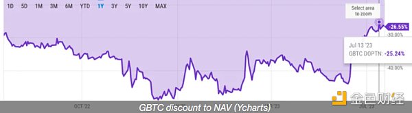 自 2021 年 2 月以來,GBTC 的交易價格一直低于其持有的比特幣。去年 FTX 爆發后,情況急劇惡化。11月,Genesis的貸款部門停止了客戶提款,GBTC負溢價增加至43%。Genesis 的困境為何會損害 GBTC 的原因尚不清楚,盡管理論認為許多交易公司都是 Genesis 的客戶,其中一些可能押注負溢價縮小,失去資金可能會阻礙這些交易策略。