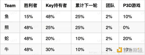 隊伍分為蛇、牛、熊、魚, 購買 Key 后,ETH 分配規則