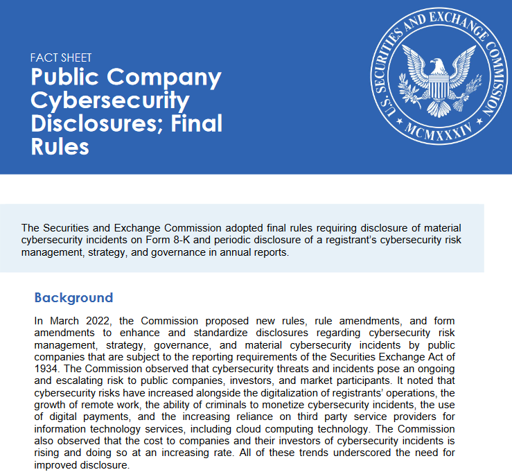 美國證券交易委員會 (SEC) 的情況說明書解釋了即將出臺的網絡安全披露規則。 資料來源:美國證券交易委員會。