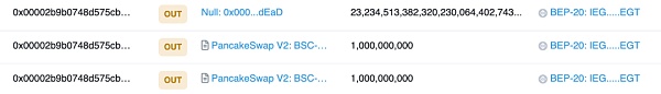 惡意代幣 IEGT 在 BSC 上的部署地址是 0x8D07f605926837Ea0F9E1e24DbA0Fb348cb3E97D。我們通過區塊瀏覽器觀察其 Holders,發現在 dead 與 pair 地址持有大量 IEGT 代幣的情況下,合約記錄的 totalSupply 仍為 5,000,000。