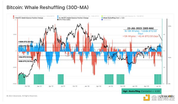 為了檢驗巨鯨重組假設,我們可以研究鯨魚細分的 30 天頭寸變化(>10K BTC ? 和 1k-10k BTC ?)。我們的目標是找到一組看到余額增加而另一組看到類似規模減少的時期。