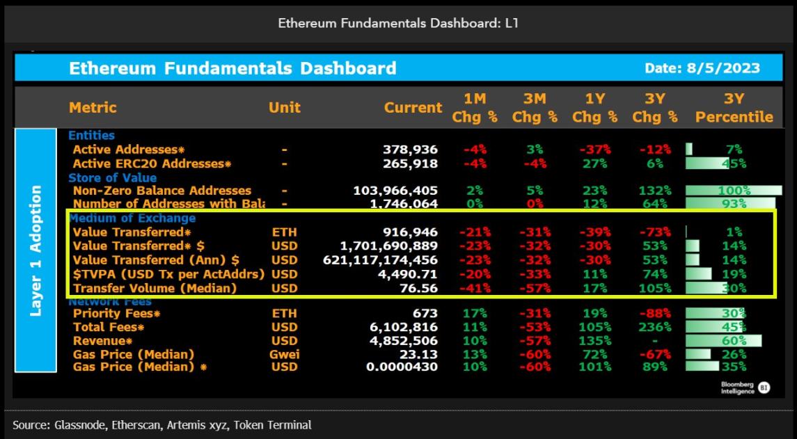 鏈上交易價值(以美元計)比一年前降低了 30%,與此同時,ETH 價格上漲了 8%。考慮到鏈上轉賬現在在 L2 上更便宜、更快,這種下降并不奇怪。