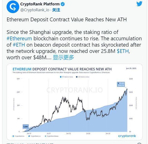 根據CryptoRank的推文,ETH存款合約價值保持高位,達到超過2580萬個ETH的歷史新高,價值高達4800萬美元。