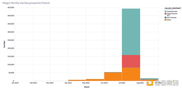 7 月份,由于 CyberConnect(一個所有賬戶都是 ERC-4337 錢包的社交網絡)推出代幣,Polygon 經歷了 ERC-4337 采用量的大幅飆升。僅 7 月份,CyberConnect 就帶動了約 36 萬次的 UserOps。
