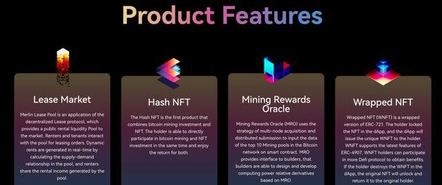 Merlin開發者團隊計劃推出4款NFTFi相關協議和產品,分別是MerlinLeasePool租賃流動性池,HashNFT比特幣算力收益NFT,MingRewardsOracle比特幣算力收益預言機,以及WNFT協議。其中HashNFT將成為比特幣算力資產化的首個實際落地應用,也是現實優質資產通過NFT技術提高自由度的典型代表項目。