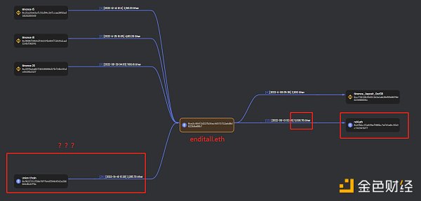 首先,通過鏈上篩查初步發現了一些與nd4.eth高度相關的地址(有大額轉賬來往)。這些地址極有可能由同一人控制,包括:endit.eth、enditall.eth、noth.eth、blackholefaller.eth、ndnow.eth。