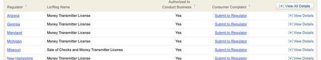 X總共擁有七個貨幣和貨幣發送許可證。資料來源:NMLS