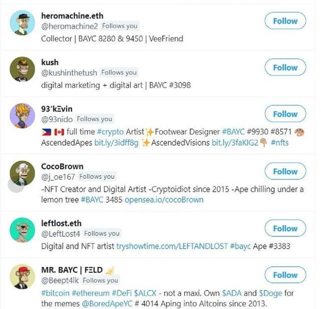 2021年5月-6月間,BAYC社區發起ApeFollowApe活動,即BAYC持有者在Twitter、Discord、Clubhouse這類社交媒體更換猿猴頭像后,猶如家人認親一般互相關注互相支持。此后很長一段時間,在推特等社交媒體上掀起一陣「猿猴頭像」的巨大潮流,BAYC將身份標識發揮到了極致。
