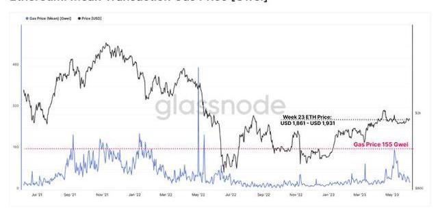 雖然ETH價格自3月以來一直保持相對平穩且區間震蕩,但天然氣價格在5月份確實經歷了不小的上漲。Gas價格上漲至76Gwei的平均Gas價格,相當于普通ETH轉賬交易的1.14美元。平均天然氣價格在5月初達到155Gwei,這幾乎與2021-22年牛市周期期間的價格一樣高。