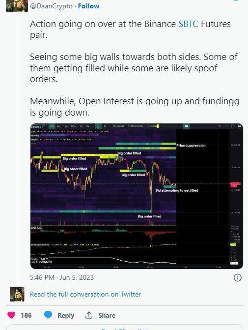 “BTC流動性在價格兩側仍然很薄弱。市場等待6月14日美聯儲加息決定。”