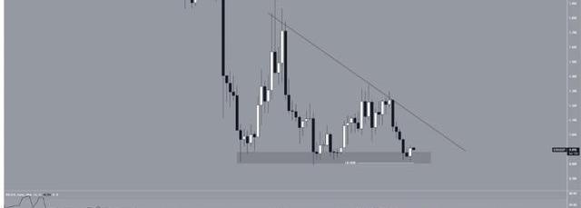 自2022年10月被水平阻力區域0.12美元拒絕以來,DOGE價格已經下跌。下跌使價格回到了自2022年6月以來一直存在的上升支撐線。這條線已經存在了這么長時間。因此,從那里突破可以催化急劇下跌。普賴斯第四次重訪這條線。每次觸摸時,線條都會變弱。因此,最終突破是最有可能的觀點。