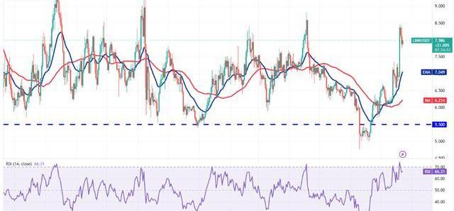 經歷幾天的上漲,知名去中心化預言機項目$LINK的價格,已經達到近幾個月以來的高峰。從日K線走勢來看,若能突破8.5-8.8美元阻力,則有望繼續挑戰9.5美元高位,而下方需要關注的重要支撐位是7.5美元,再來則是20日均線位置,即7.05美元附近。