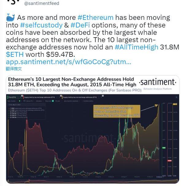雖然取消質押的趨勢引發了人們對以太坊網絡健康狀況的擔憂,但另一項發展引起了加密貨幣社區的注意。根據區塊鏈分析平臺Santiment的說法,越來越多的以太坊已經轉向自我托管和去中心化金融選項。這種轉變導致ETH集中在網絡上最大的鯨魚地址中。