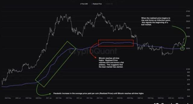 在熊市中,實際價格可能會小幅下跌。例如,在2023年1月最近的熊市期間,實際價格跌至低于2021年12月價值24,500美元的水平。這種下降的原因是長期持有者以折扣價購買比特幣,從而降低了實際價格。此外,比特幣的實際價格在本月比特幣市場價格最近下跌25%的過程中達到了熊市的最低點,使其價值達到19,800美元。