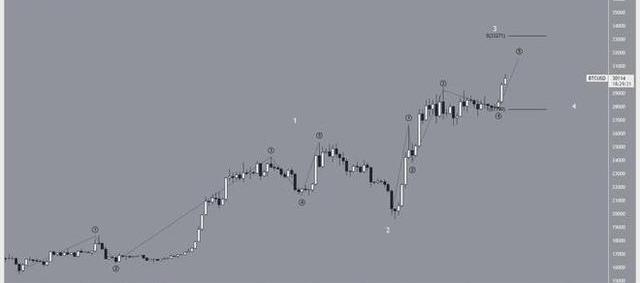 第一個表明BTC價格目前處于看漲沖動的第五波也是最后一波。浪5已經延伸并移動到浪1和浪3的長度以及浪4的1.61外部斐波那契上方。因此,下一個可能的目標是在34,500美元到35,500美元之間。