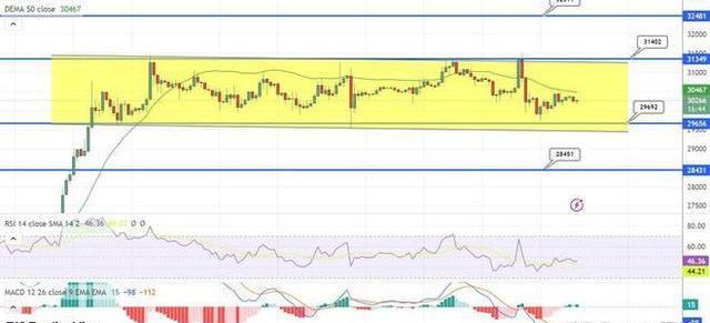 從更廣泛的角度來看,比特幣正在窄幅區間內盤整,阻力位約為31,400美元,支撐位約為29,600美元。