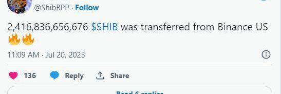 ShibaInu社區的幾位成員注意到了來自BinanceUS的SHIB代幣的大規模轉移,他們認為這筆轉移與下個月Shibarium的推出有關。