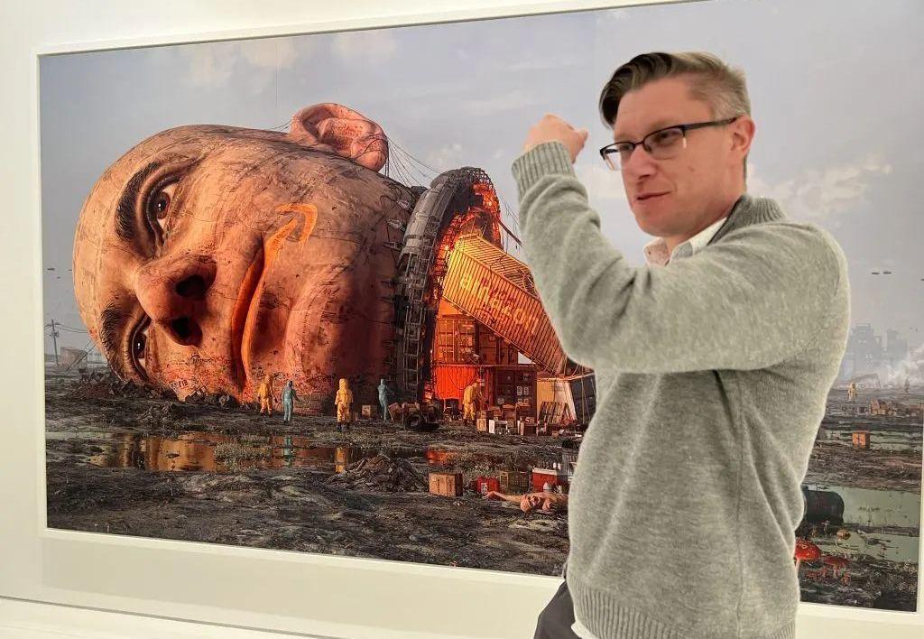 Beeple在JackHanleyGallery開幕上,旁邊是他的作品YouGotMail