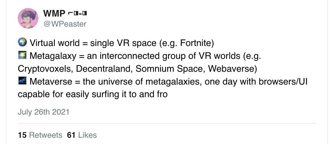 我認為元宇宙是由元星系組成的宇宙,而所謂元星系,是指一組相互關聯的個體虛擬世界。