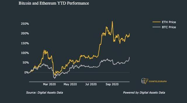 比特幣和以太坊年初至今的表現來源:DigitalAssetsData今年迄今為止,比特幣和以太坊的價格分別上漲了80.5%和217%。與此同時,PayPal上漲了99%,Square上漲了186%。另一方面,摩根大通和美國銀行分別下跌了28%和32%。花旗集團的股價下跌了46%,富國銀行的股價下跌了58%。