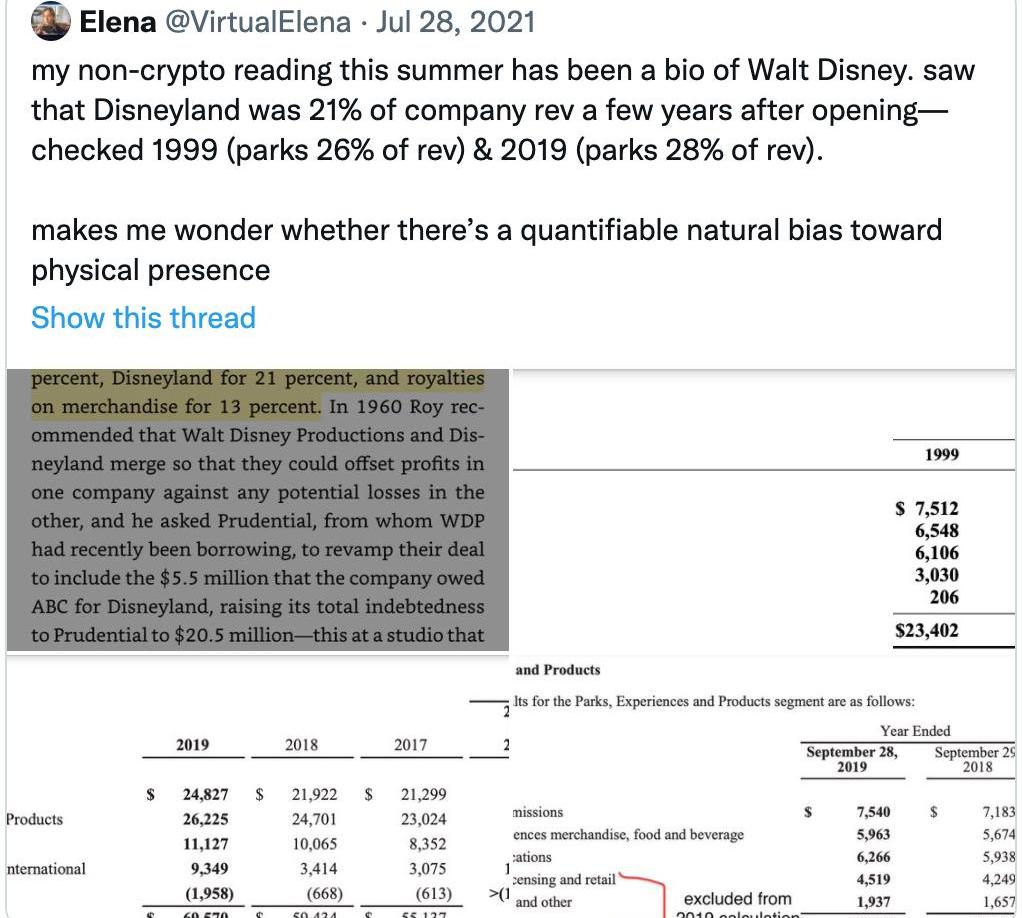 我在今年夏天的非加密貨幣方面的閱讀是沃爾特-迪斯尼的簡歷。我看到迪斯尼樂園在開業幾年后占公司營業額的21%,我也檢查了迪士尼在1999年和2019年的營收數據。這讓我想知道是否有一個可量化的自然偏向于物理存在的項目出現。未來將是以Web3為基礎的集體,它鼓勵衍生品和跨項目組合,允許藝術家、收藏家和策展人分享所有權。IRL也將是其中的一個重要組成部分。如果你打算在這個領域中深耕,請給我或@janehk發私信,我們很想和你聊聊!