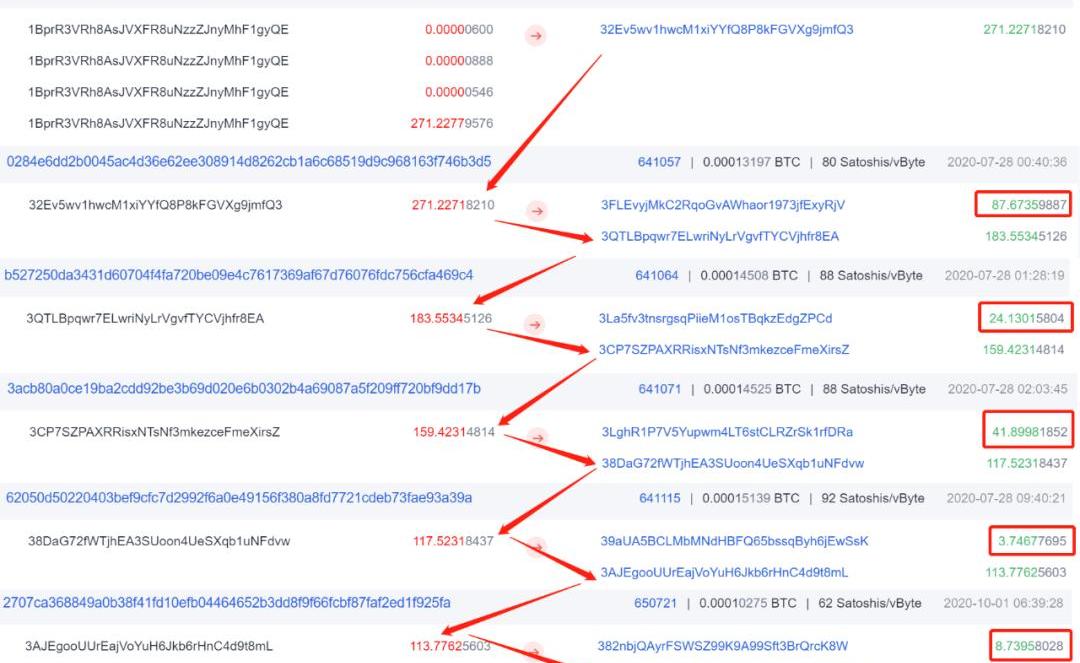 據區塊鏈瀏覽器顯示,該黑客地址盜走了271.22BTC。我們接著以大額轉移地址為目標進行追蹤: