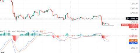 在日線圖上,BTC在16,000美元的支撐位以減弱的勢頭交易。MACD指標顯示BTC處于強勁的熊市中。該水平形成多個pinbar,表明市場猶豫不決。