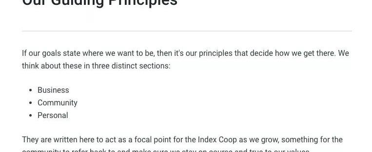 這些成分發揮作用的最好例子之一是IndexCoop,這是一家去中心化的資產管理公司,負責創建和維護加密指數產品。Index有一本社區手冊,概述了合作社業務、合作社社區和參與合作社的人員的原則。