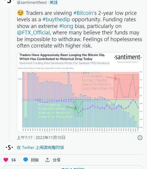 領先的加密分析公司Santiment于11月10日在推特上表示,交易員一直在積極渴望比特幣下跌。從下圖可以看出,BTC的永續合約資金費率在BTC價格下跌的同時出現了極長的偏差。與此同時,具有空頭傾向的永續合約利率下降。