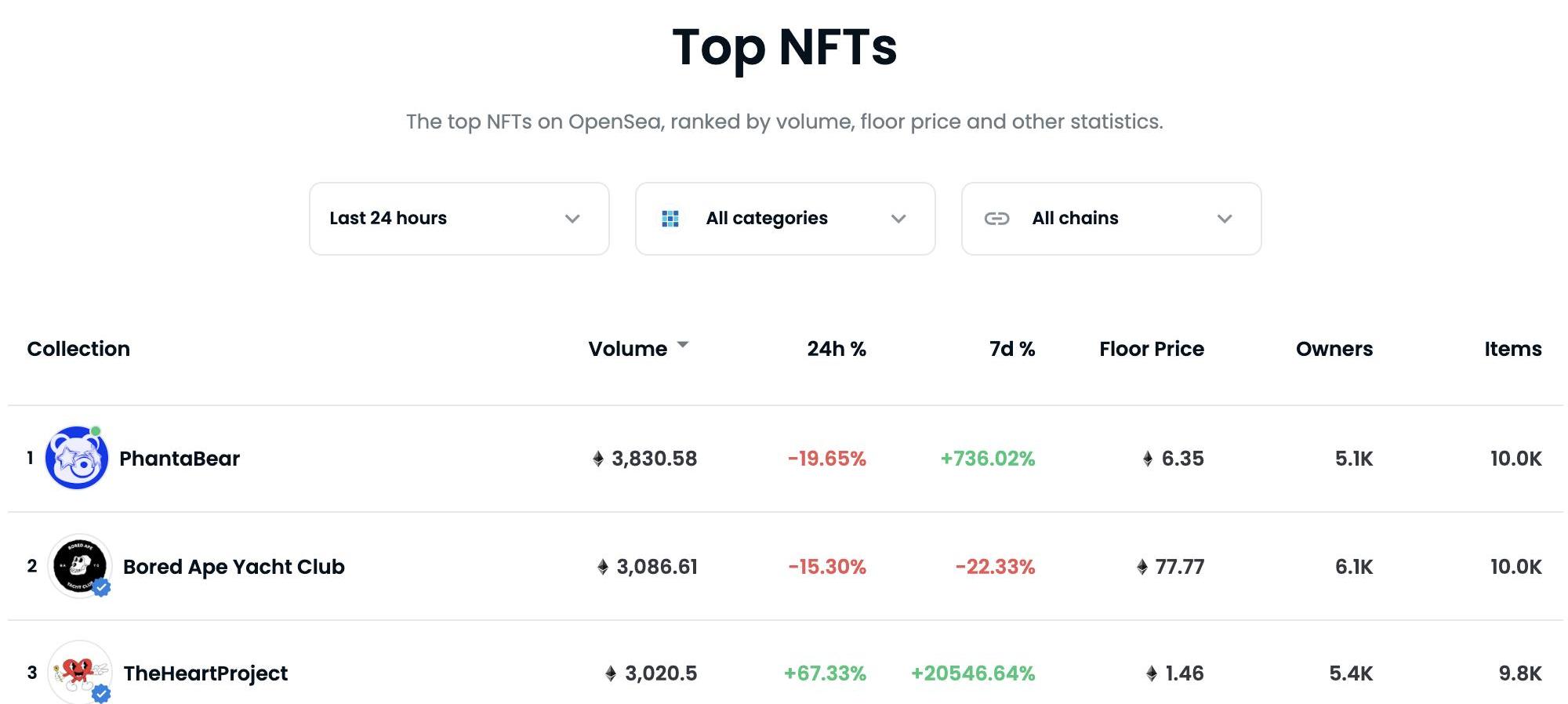 最新數據顯示,按交易量、地板價和其它數據排名,PhantabearNFT是過去24小時內OpenSea上最熱門的系列,交易量為3830.58ETH。