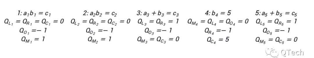 加法門:QLi=1,QRi=1,QOi=-1,QMi=0??ai+bi-ci=0乘法門:QLi=0,QRi=0,QOi=-1,QMi=1-ci+?aibi=0