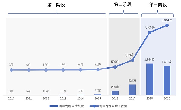 縱觀中國過去10年區塊鏈專利申請情況,超過80%的專利申請集中在2018-2019年之間。從2010-2019年專利申請情況來看,可將區塊鏈專利申請分為3個階段:
