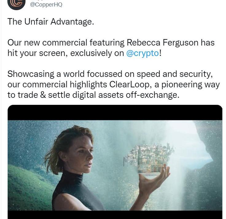 XRP/HKD-2.73%據Newsbitcoin11月10日消息,機構數字資產托管和交易解決方案提供商Copper.co宣布與科幻電影《沙丘》女演員RebeccaFerguson合作推出名為TheUnfairAdvantage的廣告,并在彭博電視臺播出。據悉,Copper是一家總部位于倫敦的加密貨幣公司,于2018年成立,迄今已籌集了8430萬美元的資金。瑞典女演員RebeccaFerguson曾出演《碟中諜2:流氓國家》和續集《碟中諜:輻射》以及《最偉大的表演家》、《黑衣人:國際》等電影而聞名,并在今年出演了的科幻史詩《沙丘》。