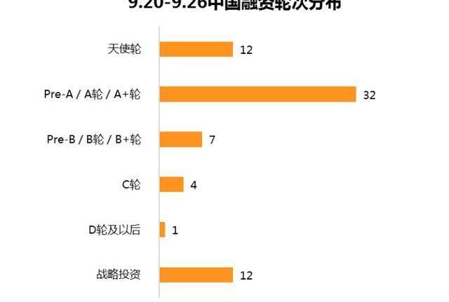 本周融資事件的融資輪次主要集中在天使輪、A輪、戰略投資,其中A輪事件最多,32起,天使輪、戰略投資次之,12起。