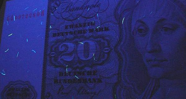 隨著熒光染料技術的發展,從上世紀7、80年代開始,無色熒光纖維成為鈔票廠商的新型秘密武器,當時還在使用馬克的西德成為最早吃螃蟹的國家之一。在紫外線的照射下,80年代的馬克紙幣表面顏色幽深,一條條無色熒光纖維卻熠熠生輝。我國在上世紀90年代掌握了無色熒光纖維技術,在第五套人民幣的多個版別中都有應用。用特定波長的紫外線照射,這些人民幣鈔票上的無色熒光纖維,會神奇地變身為黃色和藍色的細小光帶。