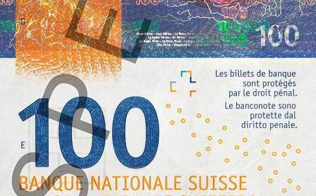 新版100瑞士法郎紙幣,藍色面額數字上方的橙色區域中,隱藏著激光微孔十字圖案。