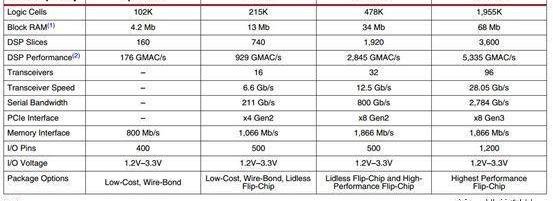 FPGA的內部資源根據產品的目標場景有不同的配置,如果需要設計高端的產品,對廠商來說也是比較具有挑戰性。拿Xilinx的Virtex7來說明一下FPGA內部資源。先看一下7系列的配置。
