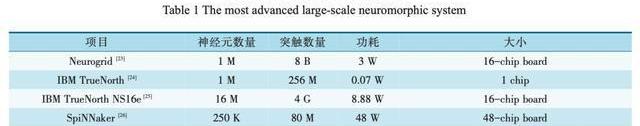 當前,最先進的神經擬態芯片仍然遠離人類大腦的規模(1010個神經元,每個神經元有103~104個突觸),至多達到104倍,如表1所示。為了達到在人腦中規模,應將多個神經擬態芯片集成在電路板或背板上,以構成超大規模計算系統。神經擬態芯片的設計目的不再僅僅局限于加速深度學習算法,而是在芯片基本結構甚至器件層面上改變設計,希望能夠開發出新的類腦計算機體系結構,比如采用憶阻器和ReRAM等新器件來提高存儲密度。這類芯片技術尚未完全成熟,離大規模應用還有很長的距離,但是長期來看類腦芯片有可能會帶來計算機體系結構的革命。