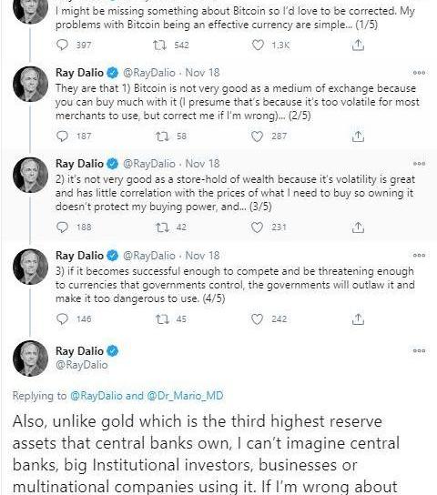 全球最大對沖基金橋水基金創始人雷·達利奧此前曾多次唱空比特幣,并在17日連發5條推特,向網友請教這輪比特幣上漲的上漲原因。