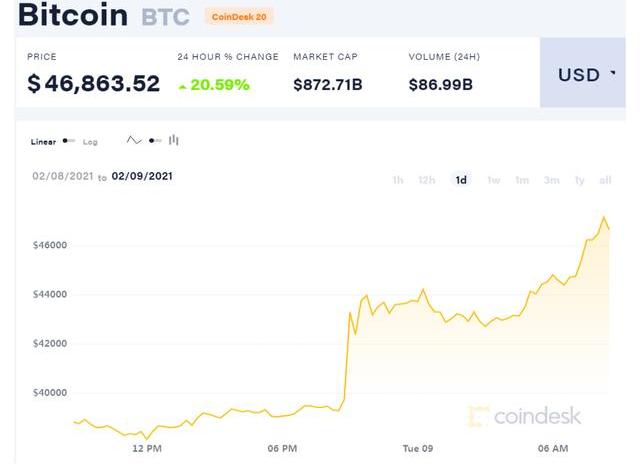 當晚,比特幣從39000多美元迅速沖破40000美元,并一路突破數道關卡站上47000美元,根據比特幣新聞資訊網Coindesk,最高價一度達到47513.57元,創下歷史新高。截至發稿最新價格為46863美元,日內漲幅超過20%,總市值達到8727億美元。