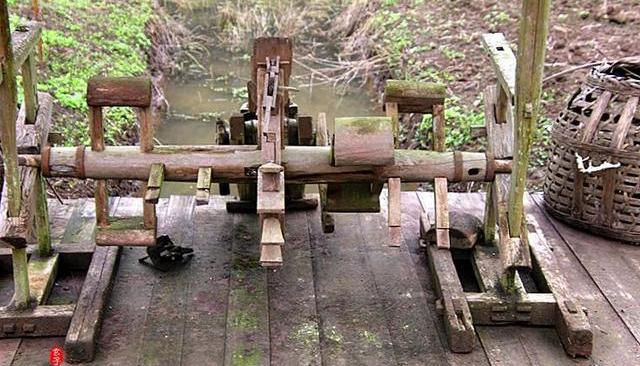 而隨著到徽州看曬秋的游客增多,像這種集體在廣場擺放而迎合游客的所謂“曬秋”,則顯得有些造假和做作;曬谷場的旁邊有片池塘,干枯的殘荷在水中呈現出不規則的凄美,通往池塘的溝渠有兩架古老的水車,讓人聯想起曾經的記憶。