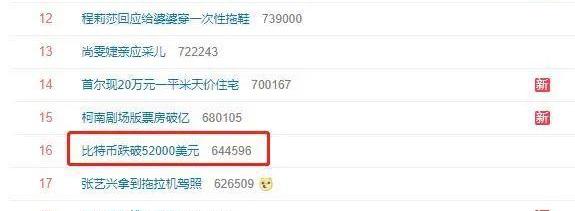 北京時間11:30分左右,比特幣跌破52000美元/枚,日內跌幅超15%。以太坊、瑞波幣、EOS等數字貨幣全線暴跌,同時沖上微博熱搜榜。