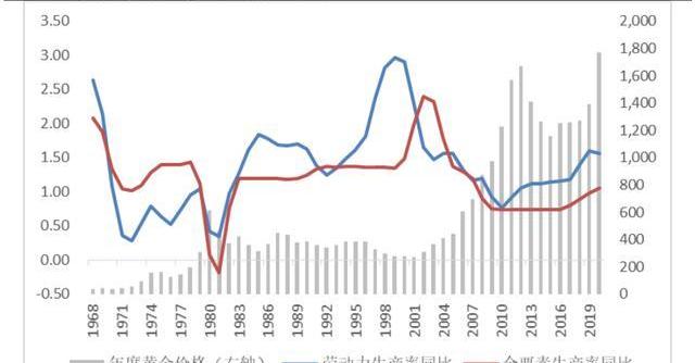美元指數與黃金負相關,并且黃金價格與美元指數出現拐點的時間基本一致,但二者之間并非直接因果關系。由于同受美國經濟和實際利率的影響,美元指數和黃金價格更像是同步變動的反向指標,而實際利率在其中充當了黃金與美元指數的“橋梁”。當美國經濟基本面整體走強時,要素生產率提高,美元信用增強、購買力增強,造成實際利率上升,表現為美元指數上升、黃金價格下降;相反,當經濟前景黯淡、美元信用削弱時,實際利率下降,美元指數下降、黃金價格上升。實際利率作為其他資產的平均回報,也能被理解成為經濟要素資源的真實回報率,其特殊表現形式是要素生產率。當經濟整體走強,經濟要素隱含的投資回報提高,此時實際利率往往較高。可以看到,黃金與勞動力生產率以及全要素生產率都呈現了負相關關系,潛在全要素生產率增長與黃金價格的相關系數達到了-0.536。這種負相關性在1980-2000年間更為明顯,期間的相關系數為-0.716。當時總統里根通過削減財政開支、減少稅收等一系列政策,創造了寬松的市場環境,激發了企業活力和投資者創業的熱情,外加信息技術革命興起,高額的實體經濟生產回報吸引了大量的投資,相比之下平淡的黃金失色不少。
