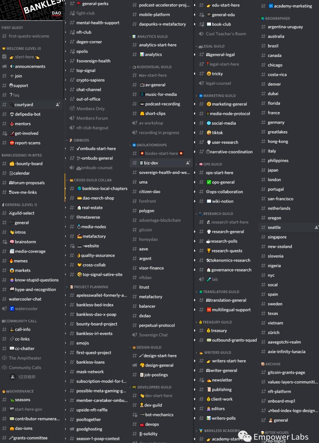 大家會問BanklessDAO是干啥的?但我至今無法給出一個精煉又準確的答案。如果當時的場合時間夠,我會用幾分鐘給大家講講BanklessDAO里好玩的事。如果時間不夠,我往往只能說“你自己去看看吧,真的挺好的。”?但當大家真的跑去BanklessDAO的discord里看了,進入的第一刻大概就會崩潰,里面竟然有200多個看起來雜亂又千奇百怪的頻道。