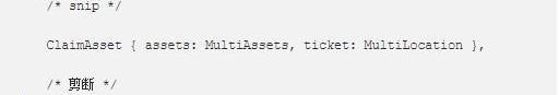 此指令的名稱可能讓人想起我們遇到的某些其他“資助”指令,例如WithdrawAsset和ReceiveTeleportedAsset。與其他方法一樣,它試圖將資產放入HoldingRegiste。與WithdrawAsset減少賬戶鏈上資產余額的不同,無論OriginRegister的值是多少,都會為這些資產ClaimAsset尋找有效的索賠。為了幫助系統找到有效的索賠,可以通過ticket參數提供信息。如果找到有效的索賠,則將其從鏈中刪除,并將資產添加到HoldingRegister中。