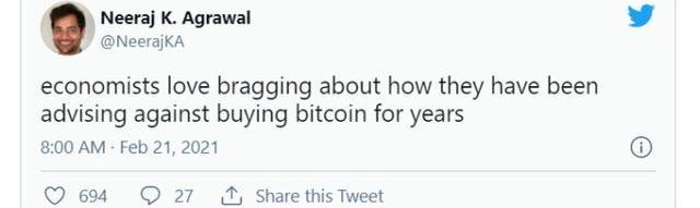 與此相反,主流經濟學家繼續從他們的象牙塔中看待比特幣。諾貝爾經濟學獎得主保羅-克魯格曼、努里爾-魯比尼、史蒂夫-漢克和其他許多人都系統地將比特幣斥為泡沫、郁金香或投機性資產,且很少考慮人們今天是如何實際使用和看待它的。